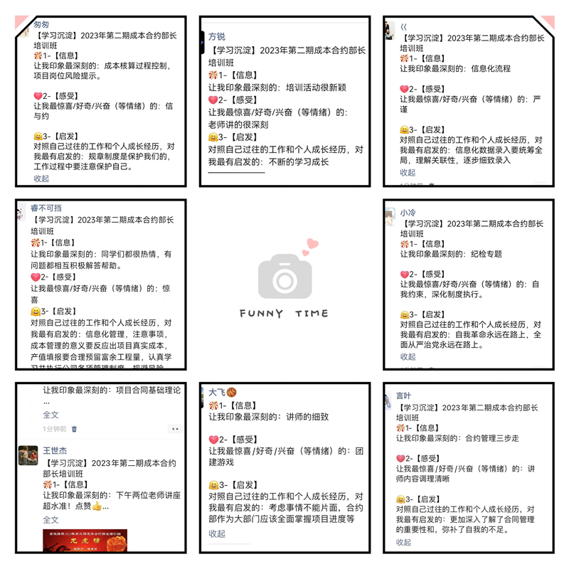 授課之余,培訓(xùn)班還安排了崗位研討與交流等學(xué)習(xí)活動,并專門開展一場“朋友圈分享學(xué)習(xí)心得”活動,讓大家暢所欲言,及時對外分享培訓(xùn)所獲——“信息、感受與啟發(fā)”,讓培訓(xùn)班的良好氛圍傳播至全公司,全面推動學(xué)習(xí)型組織建設(shè)。培訓(xùn)班還開設(shè)了一場燒腦拓展訓(xùn)練活動《極速60秒》,培養(yǎng)學(xué)員科學(xué)系統(tǒng)的思維方式,增強全局觀念。