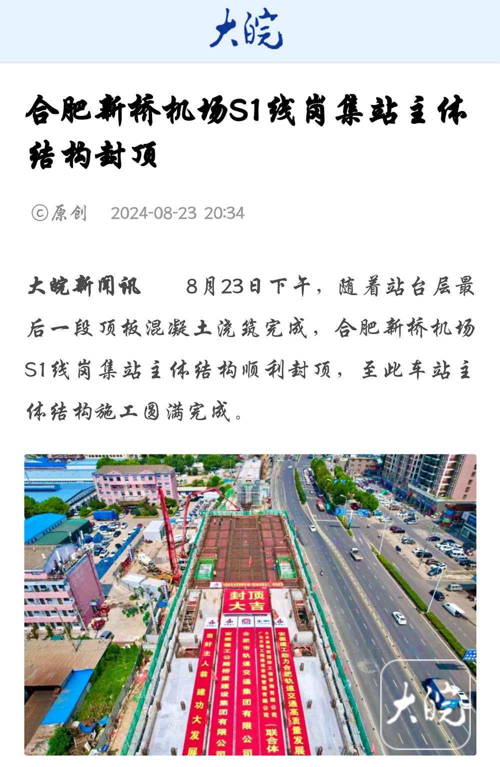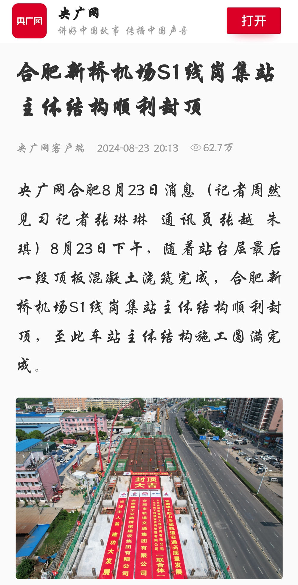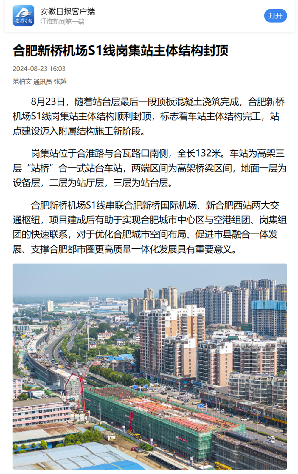 【名媒聚焦】央廣網(wǎng)、中安在線、安徽日?qǐng)?bào)等主流媒體聚焦合肥新橋機(jī)場(chǎng)S1線項(xiàng)目崗集站主體結(jié)構(gòu)封頂