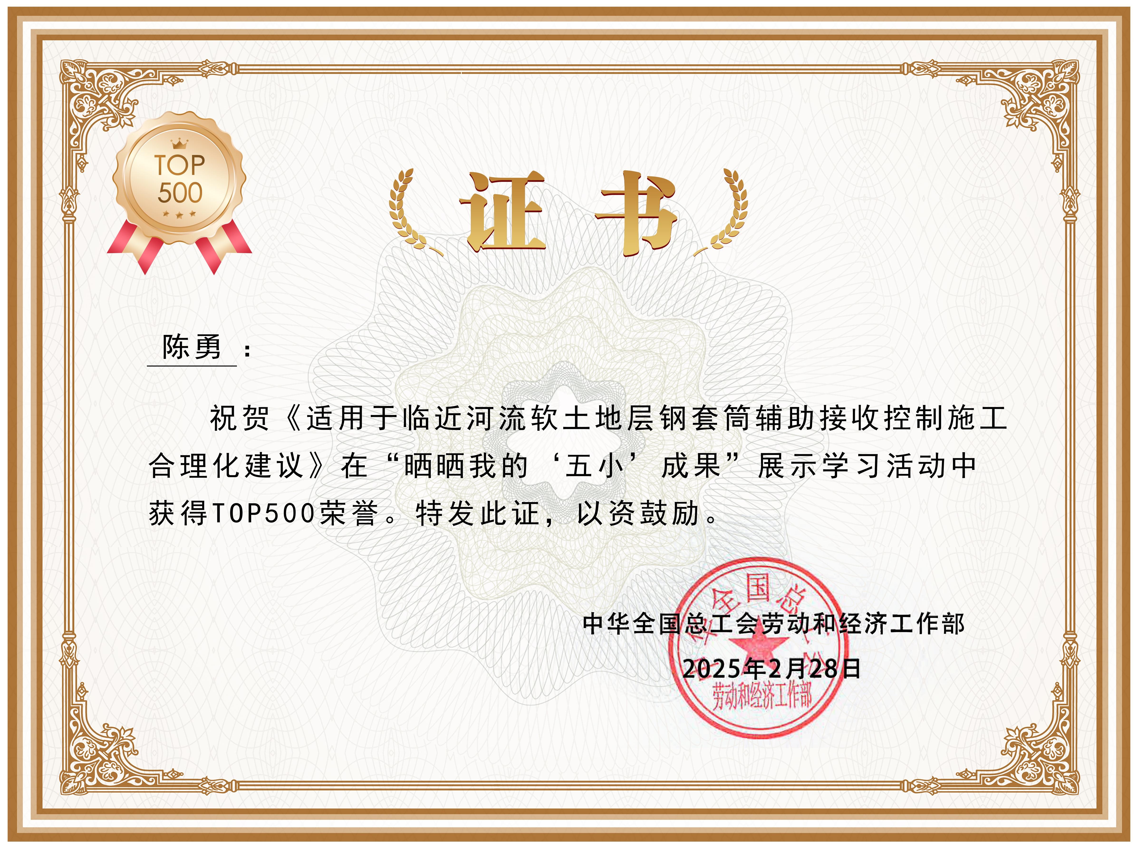 近日,中華全國總工會“曬曬我的‘五小’成果”展示學習活動結(jié)果揭曉,公司選送的《大跨度雙橢圓疊合結(jié)構(gòu)支點法施工技術》《適用于臨近河流軟土地層鋼套筒輔助接收控制施工合理化建議》經(jīng)過多輪投票,在5000個參選成果中脫穎而出,獲得TOP500殊榮,分別位列80名和147名。