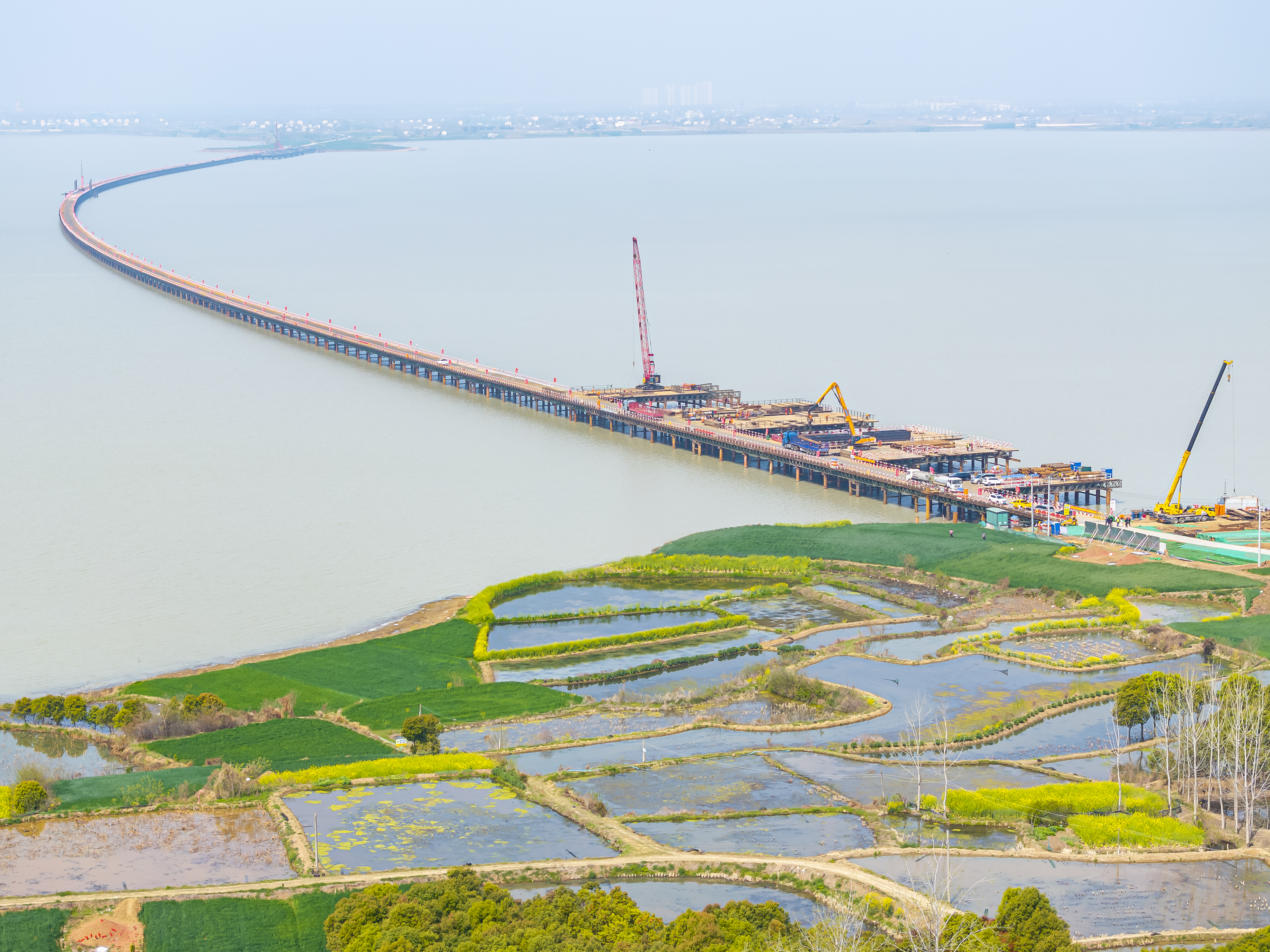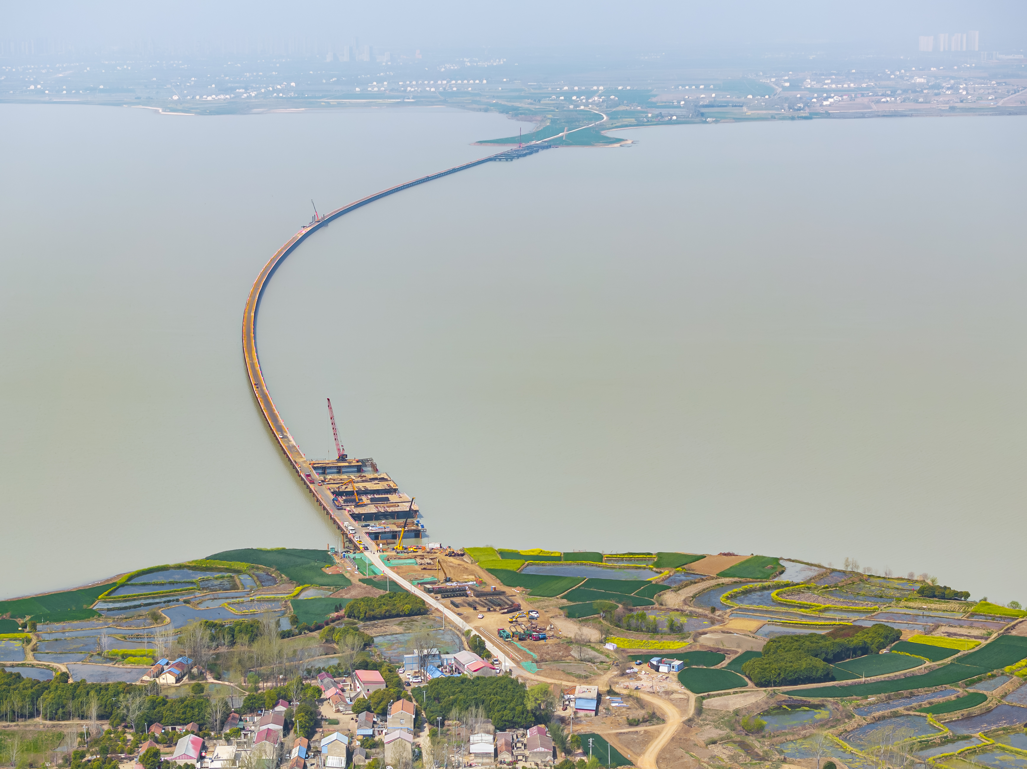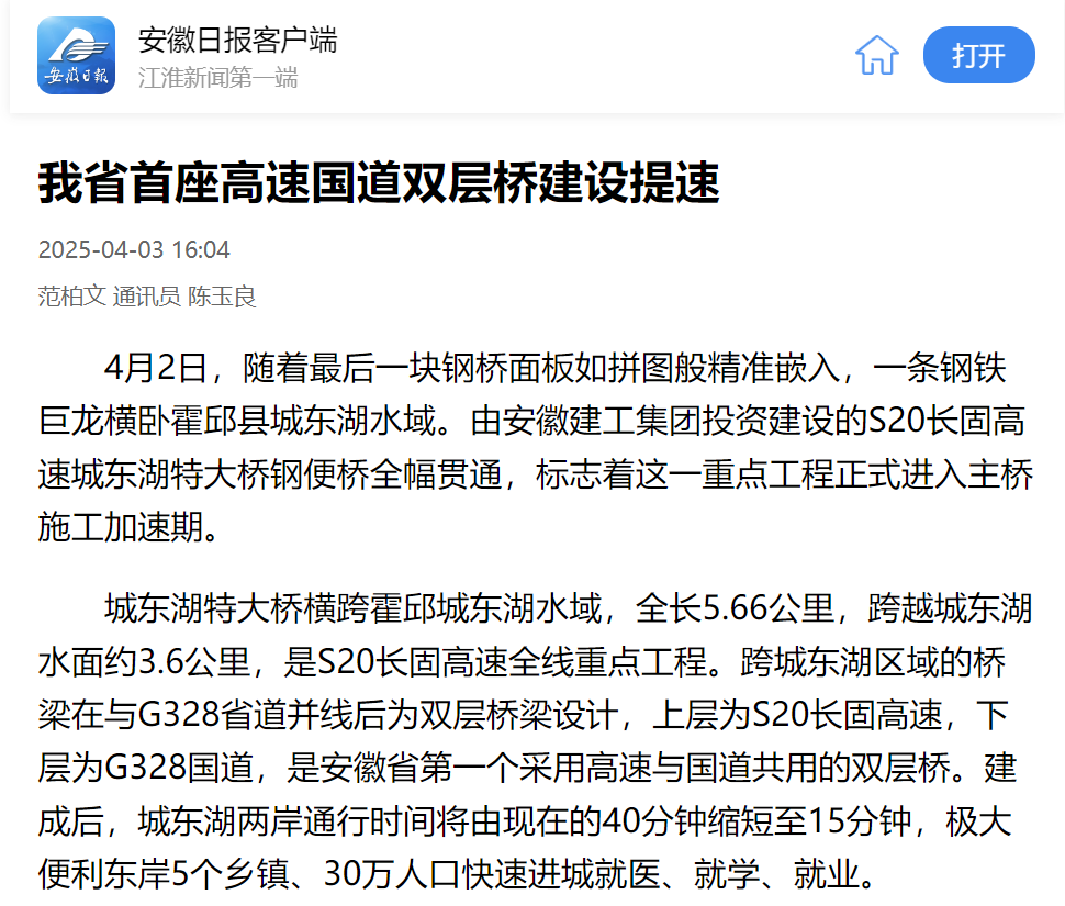 安徽建工S20長固高速路基01標工區(qū)負責人經(jīng)云介紹,城東湖特大橋橫跨城東湖水域,全程5.66km,是安徽省首個采用高速與國道共用雙層橋跨越湖泊項目,其中上層為S20長固高速,下層為G328國道。