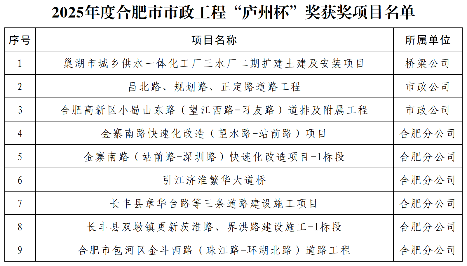 近日,合肥市市政工程協(xié)會公布了2025年度合肥市市政工程“廬州杯”獎獲獎項目名單,公司承建的9個項目榮譽(yù)登榜。