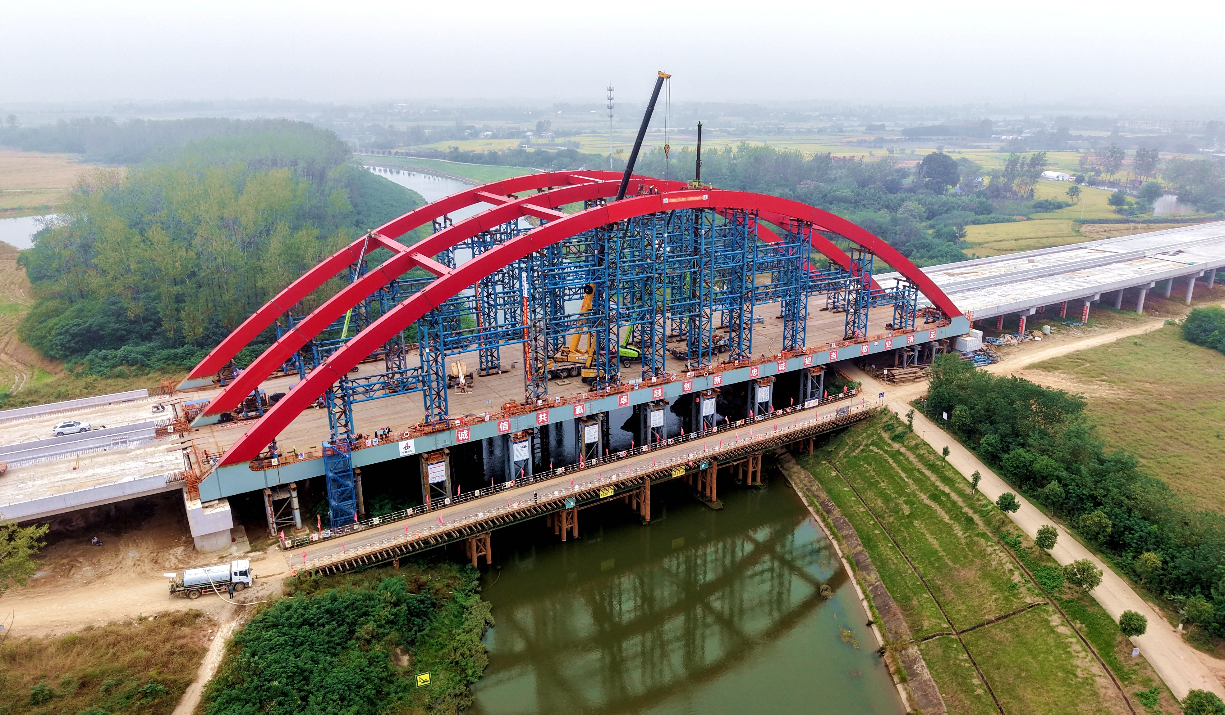 【路橋“競”行時】淮桐高速合肥段路基2標(biāo)淠河總干渠鋼箱系桿拱大橋拱肋順利合龍