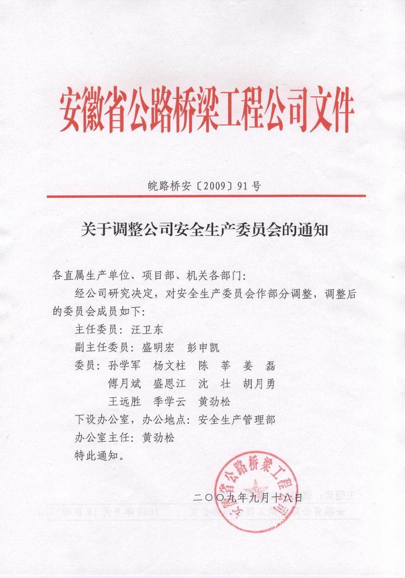 關(guān)于調(diào)整公司安全生產(chǎn)委員會的通知