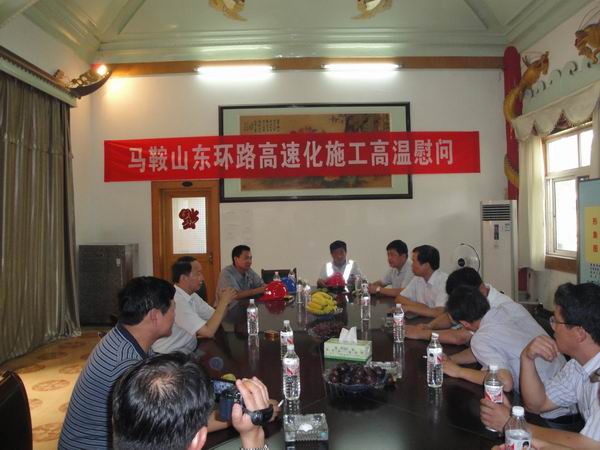 在我項目部大廳,王書記首先發(fā)表了熱情洋溢的講話,高度贊揚了我項目勇戰(zhàn)高溫、搶抓工期、誓保質(zhì)量的大無畏施工精神。隨后,王書記又送上了慰問信,并與員工代表們一一握手,發(fā)放慰問金、慰問品。最后,在項目部會議室,王書記一行與蘇指揮長,蔡主任、江主任,總監(jiān)代表郭亮以及我部項目經(jīng)理冷峰等進(jìn)行座談,詳細(xì)了解了我南環(huán)02標(biāo)項目的整體情況以及近期施工的進(jìn)展情況,希望我部繼續(xù)發(fā)揚安徽省路橋公司攻堅克難的優(yōu)良傳統(tǒng),保質(zhì)保量的如期完成東環(huán)02標(biāo)項目建設(shè)任務(wù)。