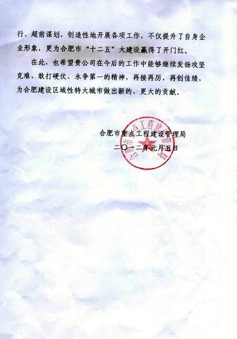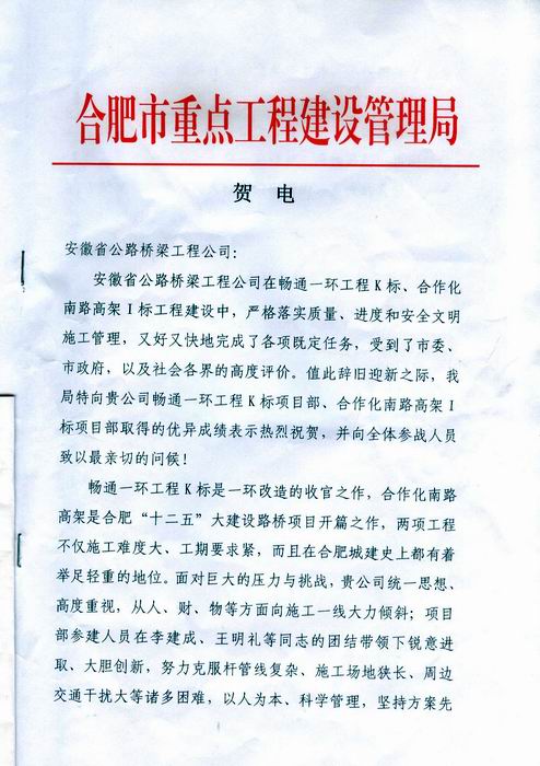 合肥市重點(diǎn)局發(fā)賀電對公司在市政建設(shè)中的優(yōu)異成績表示祝賀