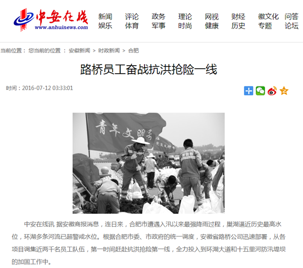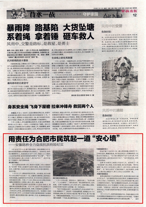 省級媒體聚焦公司抗洪搶險工作 發(fā)布時間:2016年07月13日 來源:黨委辦公室 發(fā)布人: 作者:王東 瀏覽:4209次 近日,公司積極響應合肥市委、市政府號召,全力參與環(huán)湖大道和十五里河抗洪搶險的事跡得到社會的高度關注。7月12日、13日,中安在線、《安徽商報》等多家省級媒體對公司抗洪搶險事跡進行了連續(xù)報道。