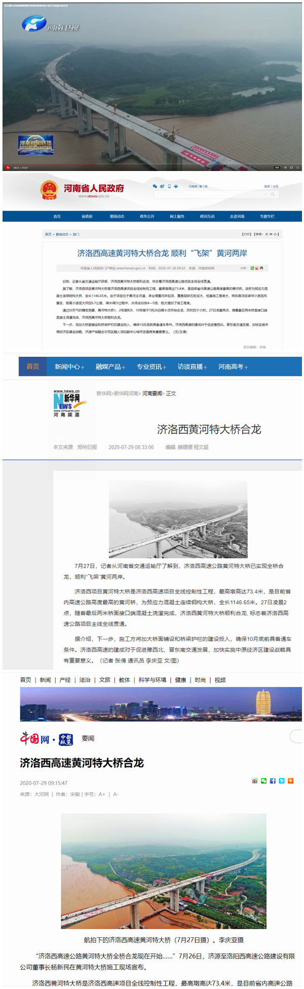 7月26日至27日,中新社、河南衛(wèi)視、河南日?qǐng)?bào)、東方今報(bào)等多家省部級(jí)主流媒體,深入濟(jì)洛西高速黃河特大橋施工現(xiàn)場(chǎng),現(xiàn)場(chǎng)采訪并共同見證了目前河南省內(nèi)墩高最高的黃河特大橋合龍。