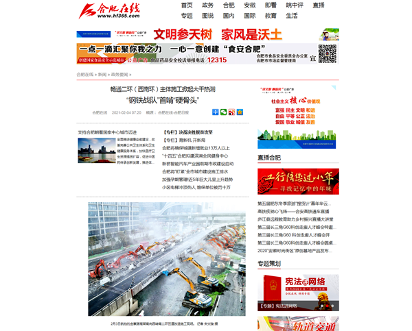 人民網(wǎng)【新春走基層】專欄報(bào)道了該項(xiàng)目大年三十工地不打烊,參建人員持續(xù)奮戰(zhàn)在施工一線。中國日?qǐng)?bào)海外版《End of the road》、合肥日?qǐng)?bào)《“鋼鐵戰(zhàn)隊(duì)”首啃“硬骨頭”》報(bào)道了公司第二次對(duì)老舊匝道橋拆除工作的場(chǎng)景。安徽衛(wèi)視超級(jí)新聞場(chǎng)等媒體以《“鋼鐵戰(zhàn)士”組隊(duì) 南二環(huán)改造工程第二階段施工啟動(dòng)》報(bào)道了南二環(huán)改造工程順利進(jìn)入第二階段施工節(jié)點(diǎn)的訊息。學(xué)習(xí)強(qiáng)國合肥學(xué)習(xí)平臺(tái)、澎湃新聞以《合肥:暢通南二環(huán) 鉚足干勁 大干正酣》為題,合肥新聞聯(lián)播以《“步履不?!北惩?nbsp;建設(shè)按下“快進(jìn)鍵”》《過年堅(jiān)守南二環(huán) 來年道路早暢通》為題,報(bào)道了春節(jié)期間該項(xiàng)目施工現(xiàn)場(chǎng)干出的“加速度”。抖音等自媒體平臺(tái)以短視頻形式展示了數(shù)十臺(tái)機(jī)械同時(shí)作業(yè)的震撼場(chǎng)面,關(guān)注熱度超過3百萬,安徽路橋速度得到合肥市民的再次點(diǎn)贊。