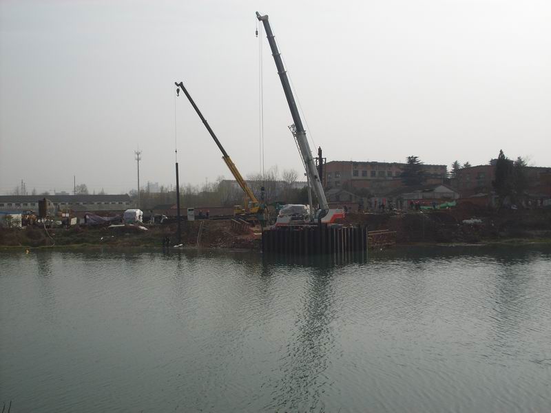 淠望路大橋作為市政工程具有工期緊、任務(wù)重、技術(shù)難度大的特點(diǎn),但經(jīng)項(xiàng)目部領(lǐng)導(dǎo)精心組織、科學(xué)部署,加大人力與設(shè)備的投入,自2月1日進(jìn)場開工以來,全部90根挖孔樁已開挖41根,累計(jì)深度270m;于2月18日開始進(jìn)行關(guān)鍵工序——主墩右幅鋼板樁圍堰施工。由于淠史杭干渠承擔(dān)皖豫兩省14個縣(區(qū))的春耕灌溉任務(wù),六安市重點(diǎn)辦要求加快施工進(jìn)度,必須在4月15日完成所有水下工程及用于水面以上施工的支撐等,并于4月25日前完成圍堰拆除清理工作。項(xiàng)目部立即召開緊急動員會,號召全體技術(shù)人員克服一切困難和挑戰(zhàn),堅(jiān)決完成上級交代的任務(wù),并立即組織技術(shù)人員根據(jù)鋼板樁長度、水深、地質(zhì)、承臺埋置深度等情況,制定了科學(xué)的施工技術(shù)方案、成立了以項(xiàng)目部經(jīng)理、副經(jīng)理為組長的安全領(lǐng)導(dǎo)小組。施工所用的T90振動錘、70t吊車、25t吊車、PC200挖機(jī)、 T100推土機(jī)、ZLM50裝載機(jī)、自卸車等重型機(jī)械設(shè)備陸續(xù)開進(jìn)施工現(xiàn)場。