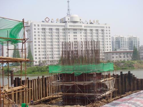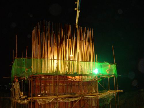 2009年4月21日下午,六安市淠望路大橋主墩5號(hào)右幅第一節(jié)(6米)墩身混凝土澆筑完成,標(biāo)志著淠望大橋主墩已順利出水,提前完成階段性目標(biāo)。大橋主墩墩身截面尺寸3.5米×6米,高11米,分兩次完成。