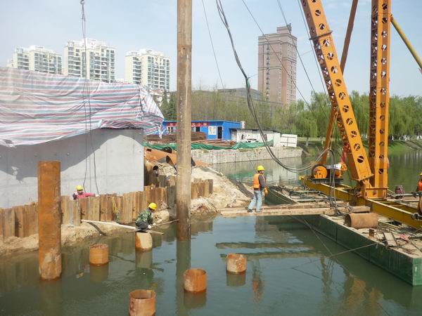 項(xiàng)目部自3月13日開打河中鋼管樁以來(lái),克服了合肥市連續(xù)陰雨天氣和南淝河生態(tài)補(bǔ)水的影響,并努力克服了夜間不能作業(yè)的影響,在異常緊迫的工期壓力下,于4月初完成右半幅一百多根鋼管樁的打設(shè)作業(yè)。并在右半幅貝雷架架設(shè)完成后,開始進(jìn)行左半幅鋼管樁的打設(shè)作業(yè)。目前河中鋼管樁和承臺(tái)鋼管樁打設(shè)已經(jīng)全部完成,下一步,項(xiàng)目部將進(jìn)行左半幅滿堂架施工。