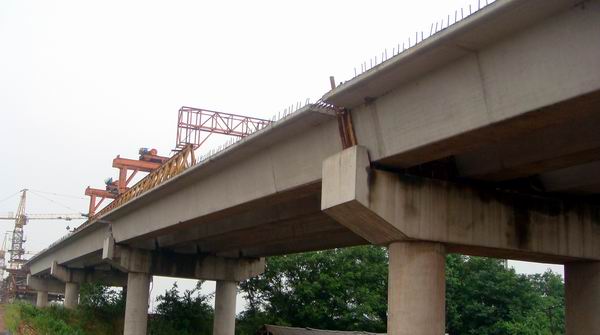 江南的7月是個多雨的季節(jié),自進(jìn)入7月以來,青弋江項目遇上連日暴雨,長江水位猛漲,青弋江水位也隨長江水位增高和上游陳村水庫泄洪而增高,一度超過了98年同期水位,致使對岸紅星圩大堤被縣防指封堵,東岸施工平臺被淹,被迫停工半月之余。再加上受洪水、停電、停水等不利因素的影響,項目生產(chǎn)出現(xiàn)困難,但項目部及時調(diào)整施工方案和對策,不等不靠,采取靈活方案,積極進(jìn)行施工生產(chǎn):主橋不能干就干引橋,白天不能干就晚上干,停電就自己發(fā)電,沒有水就挑水或買水……努力克服重重困難,保工期、保質(zhì)量。到月底即7月31日止,共完成32片30M箱梁的安裝,主橋已完成5#墩的7#塊、6#墩的5#塊的澆筑任務(wù),預(yù)計8月底能完成主橋全跨的合攏任務(wù)。9月份全橋?qū)⑦M(jìn)入上部橋面系的施工,全橋預(yù)計在10月底全部完工。