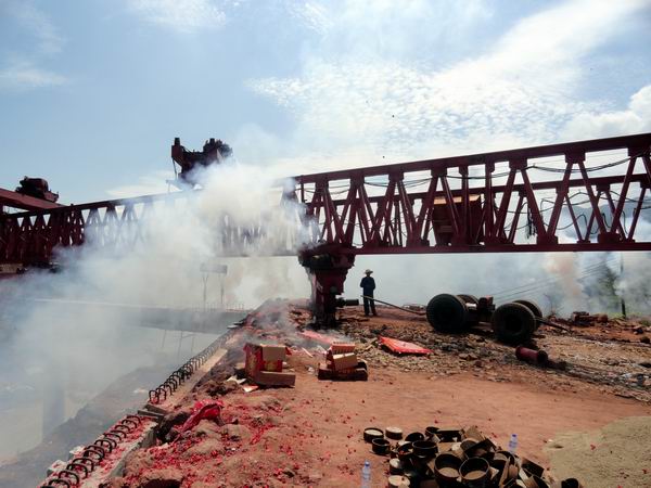 上午10點(diǎn)30分,項(xiàng)目辦、高駐辦等相關(guān)領(lǐng)導(dǎo),在公司總經(jīng)理助理丁世國(guó)、項(xiàng)目經(jīng)理羅權(quán)等的陪同下,親臨我盤石分離立交梁板安裝施工現(xiàn)場(chǎng)指導(dǎo)安裝工作。10點(diǎn)40分,架梁工作正式開(kāi)始,現(xiàn)場(chǎng)頓時(shí)鞭炮齊鳴、禮花綻放。 10點(diǎn)58分,首片梁板順利安裝。