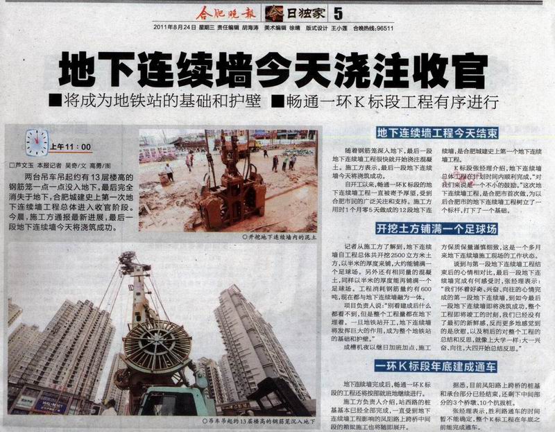 合肥晚報(bào)重點(diǎn)報(bào)道一環(huán)K標(biāo)地下連續(xù)墻施工 發(fā)布時(shí)間:2011年08月29日 來(lái)源: 發(fā)布人: 作者: 瀏覽:3141次
