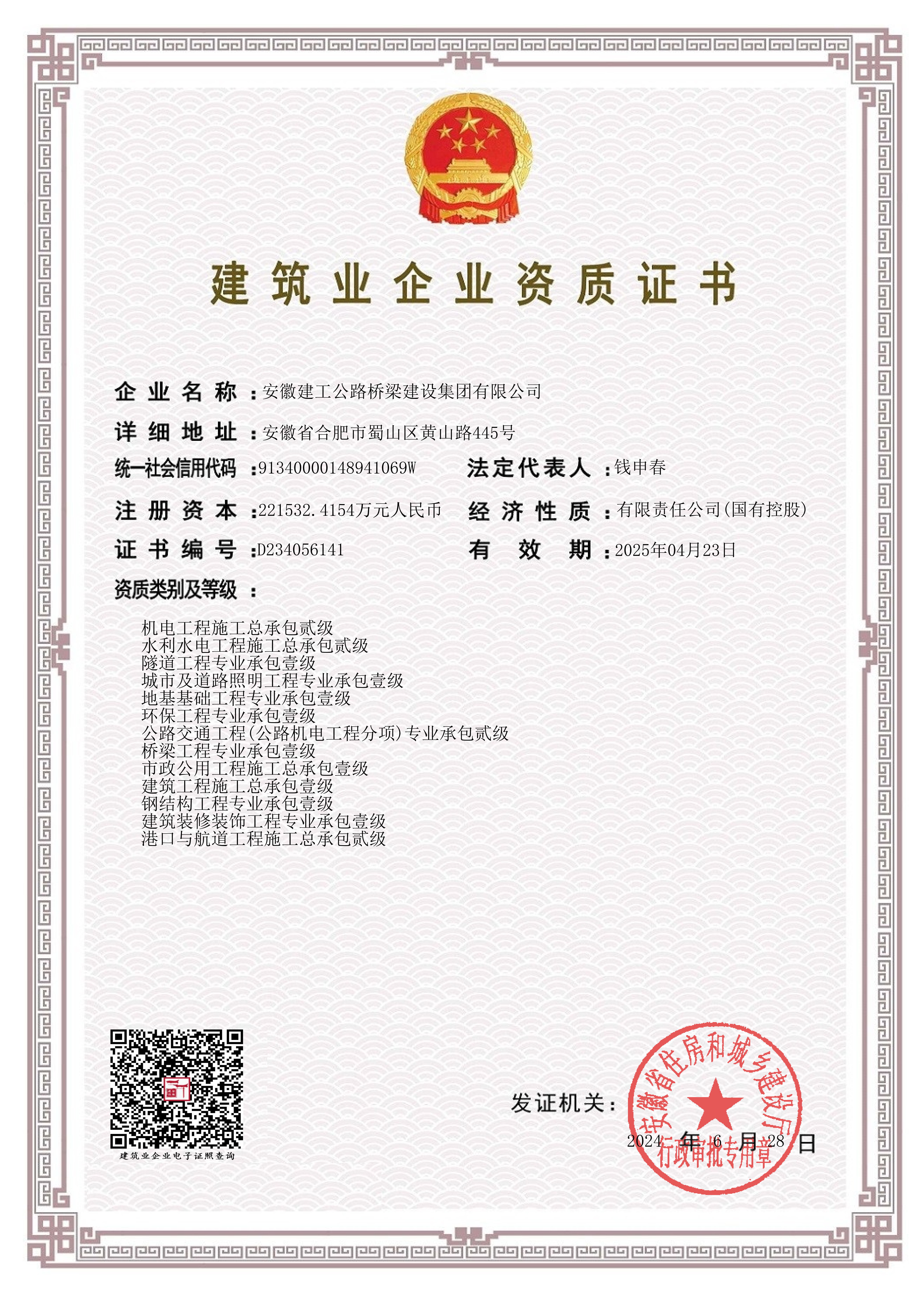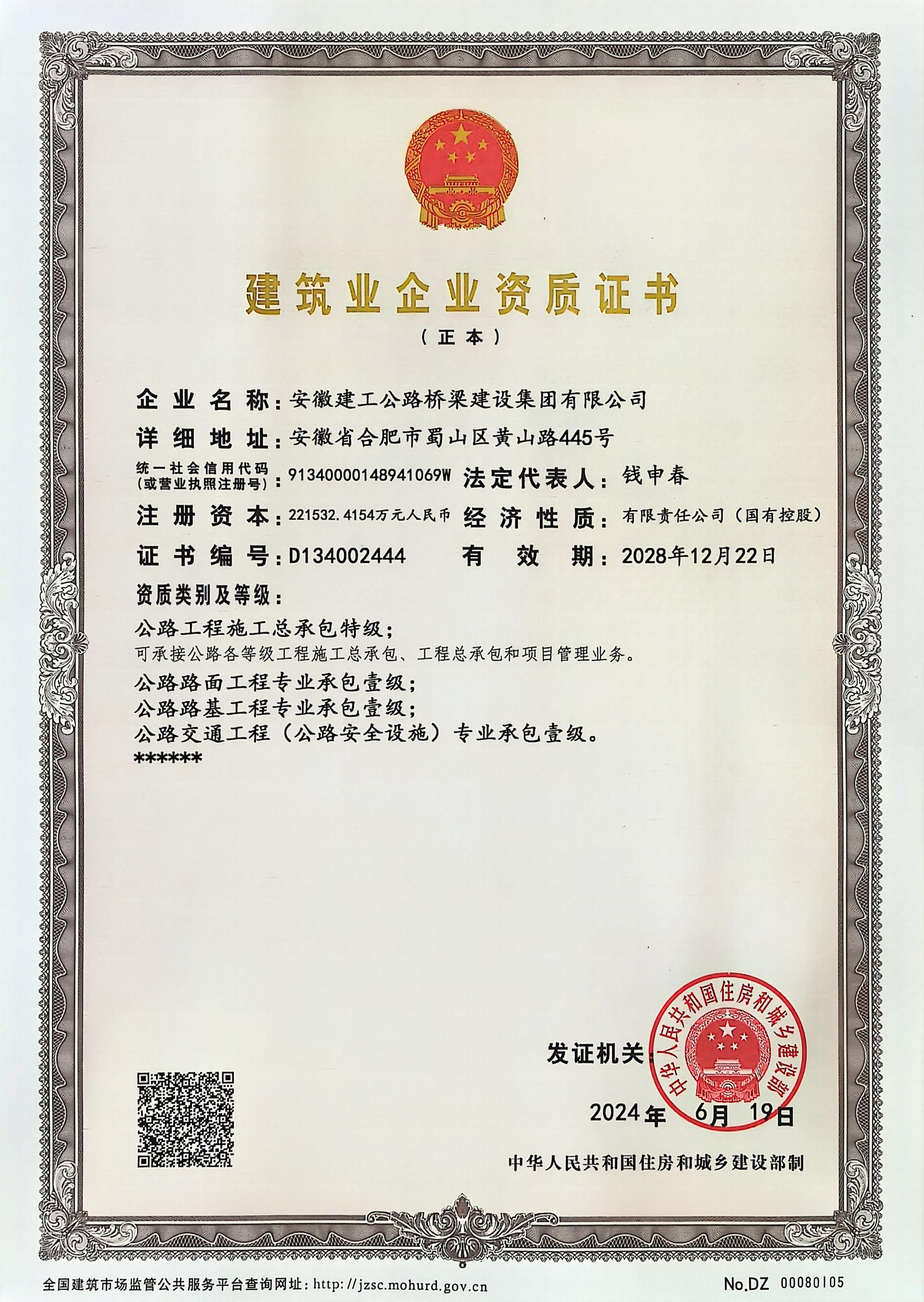 隧道工程專業(yè)承包壹級、城市及道路照明工程專業(yè)承包壹級、地基基礎工程專業(yè)承包壹級、環(huán)保工程專業(yè)承包壹級、橋梁工程專業(yè)承包壹級、市政公用工程施工總承包壹級、建筑工程施工總承包壹級、鋼結(jié)構(gòu)工程專業(yè)承包壹級、建筑裝修裝飾工程專業(yè)承包壹級